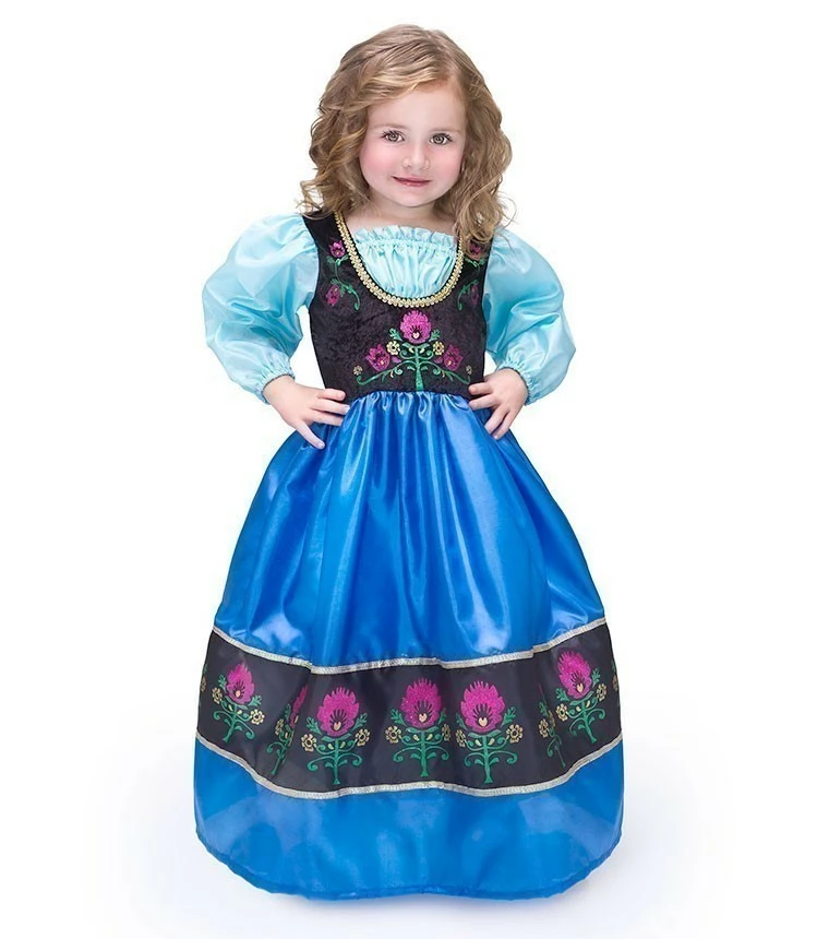 Let your little one dress up like her favourite heroine princess in this unique dress. The gathered inset, china silk sleeves and intricate gold trim frame the black velvet bodice. The royal blue skirt features a black border consisting of sparkly ruffled tulips. The dress is adorned with a gold sequined hem along the bottom of the skirt. To complete this winter story purchase the Scandinavian Princess and her sister the Ice Princess. Features:: clothing quality fabrics; machine washable. Stretchy, soft and very comfortable. Size: M