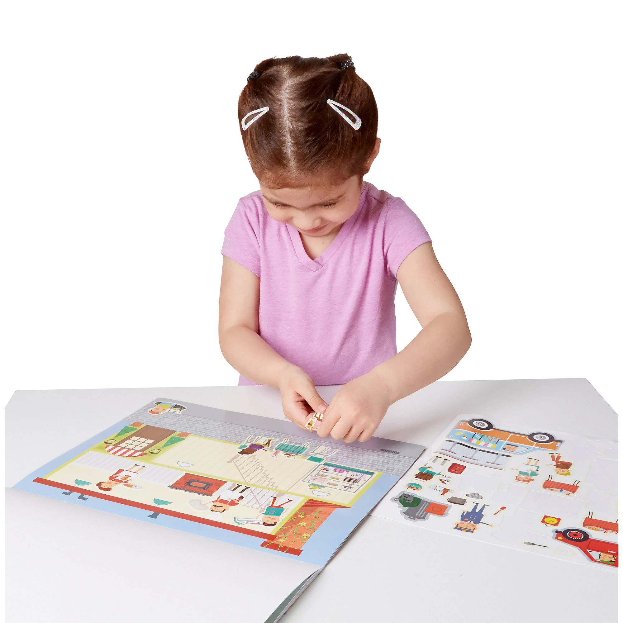 Use over 200 reusable stickers that include characters, vehicles, and furniture to fill five reusable play scenes! Glossy reusable backgrounds feature a school, grocery store, restaurant, hospital, and fire house, all with inviting cross-section art to encourage imaginative play and storytelling.