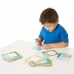 Discover alphabet flashcards and a reusable colouring activity in one! This set of 26 learn-and-play cards comes with a chunky, easy-to-grasp water pen that’s perfect for pre-schoolers and beginning writers. Each card features a letter of the alphabet, with upper – and lowercase letters to trace and a magic – reveal animal picture to illustrate the letter sound. Kids love to see the alligator, butterfly, and cow appear as they color in their ABCs! The pictures and letters turn white again as each card dries, so they can be reused endlessly as children improve letter recognition, letter formation, and hand-eye coordination. Store the whole set in the sturdy box, or clip the cards together with the included clasp to customize an on-the-go learning pack!