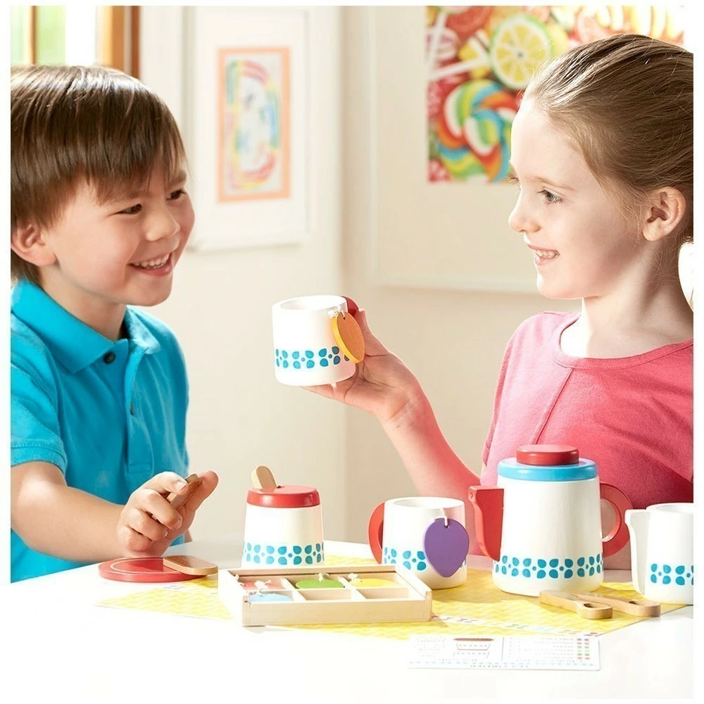 Tea bags with brightly coloured tags store in a handy tea caddy and the wipe-off order card makes tea selection a snap! This adorable tea service encourages creative thinking and imaginative play and promotes memory and color recognition. Who’s ready for tea for two?
