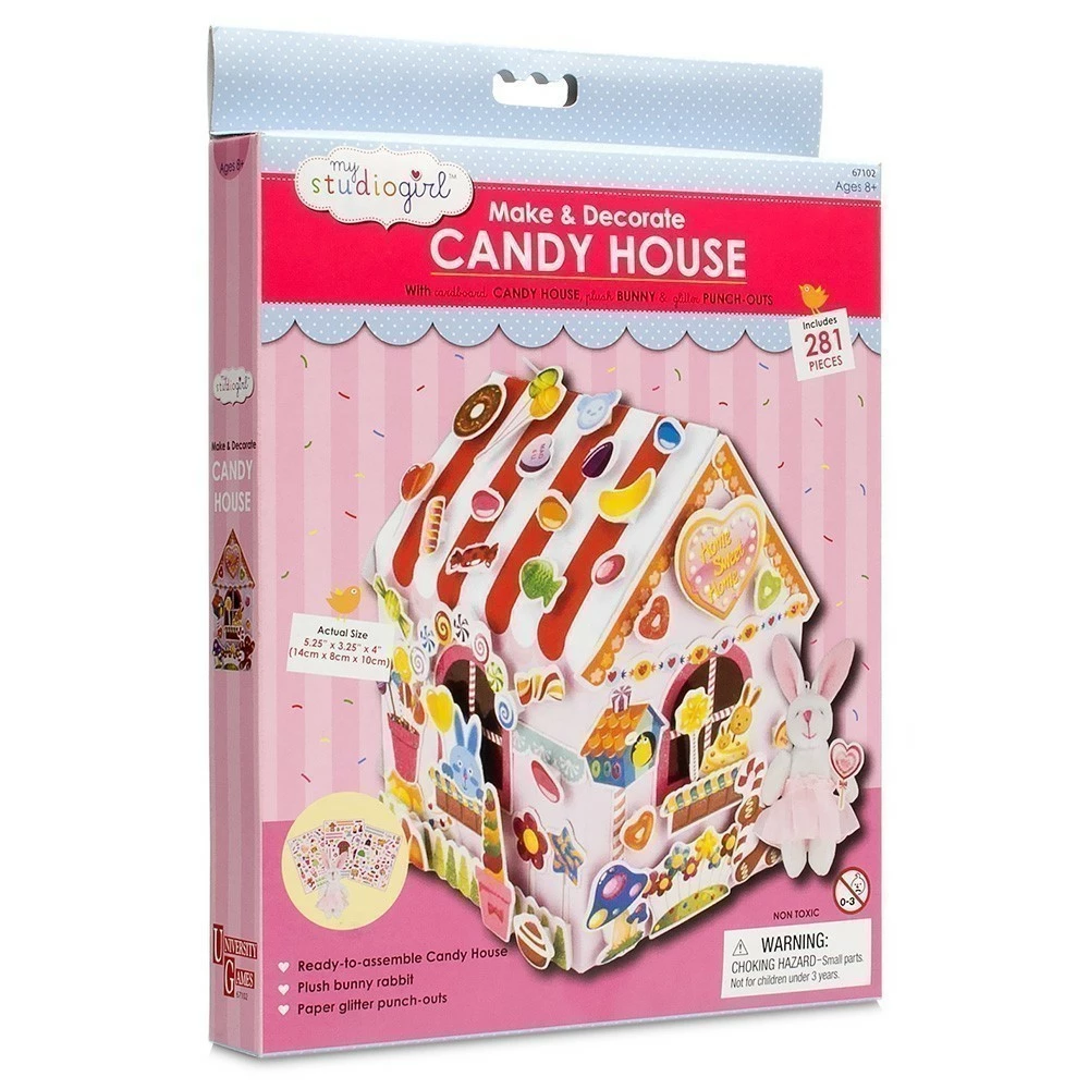 Make, decorate and display the sweetest Candy House in the land with the My Studio Girl™ Make & Decorate Candy House by University Games! Use all your craft skills to put this lovely house together for your bunny rabbit to live in. Decorate it with all the paper glitter punch-outs and make it shine and delicious!