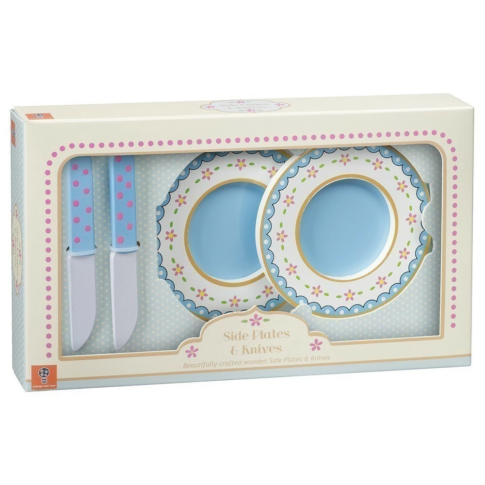 Beautifully painted in lovely colours and vintage design, this set of wooden side plates & knives are the perfect addition to any tea party. Set of 2 wooden toy side plates & knives.