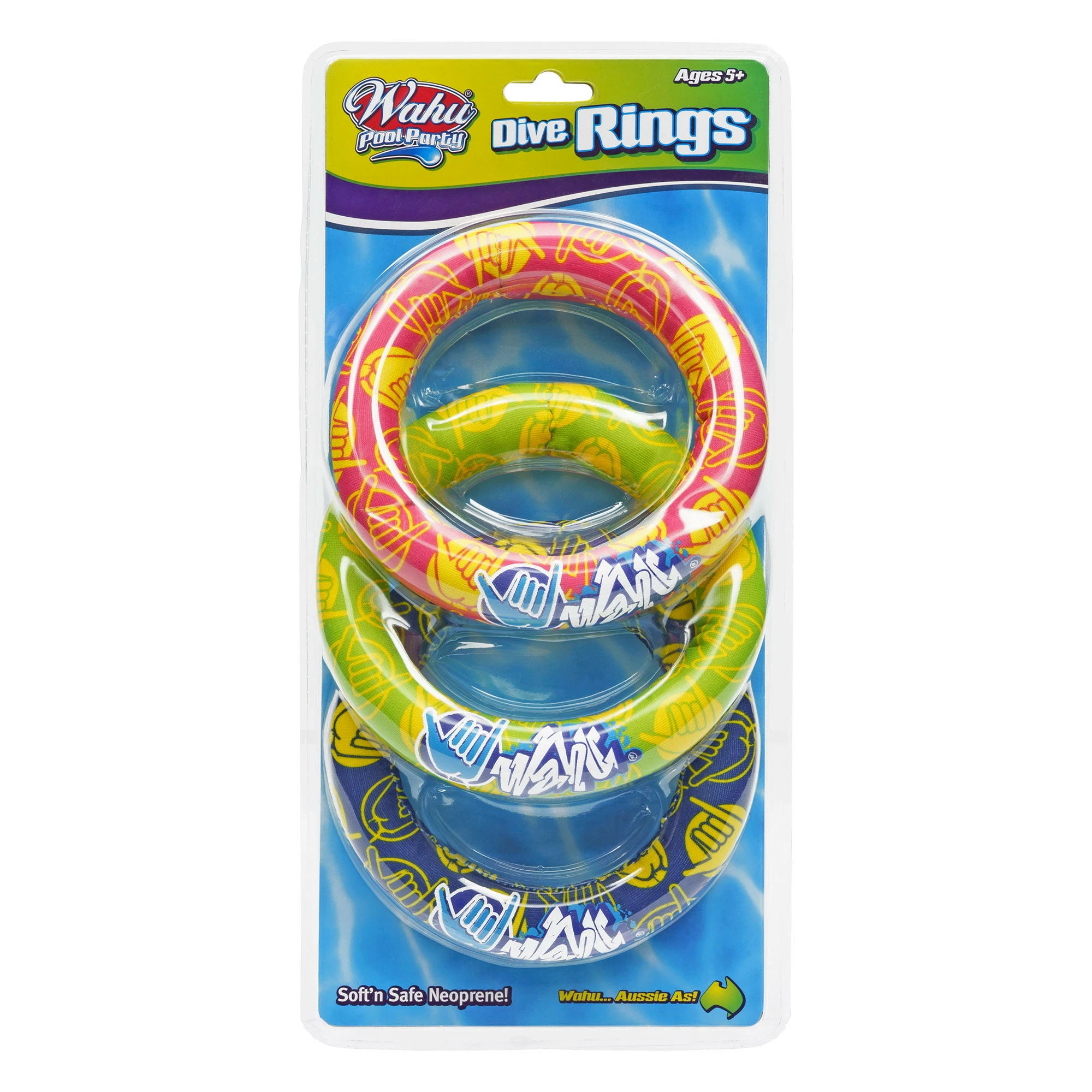Toss the Wahu® Dive Rings into the water and watch ’em sink to the bottom, for deep-diving, search and collect underwater fun!. Great for pool parties, pool games and diving practice. Each Dive Ring is protected by a soft Neoprene skin and measures approximately 14cm in dimaeter. Perfectly weighted, Wahu Dive Rings sink to the bottom quickly so you can dive straight in after them.